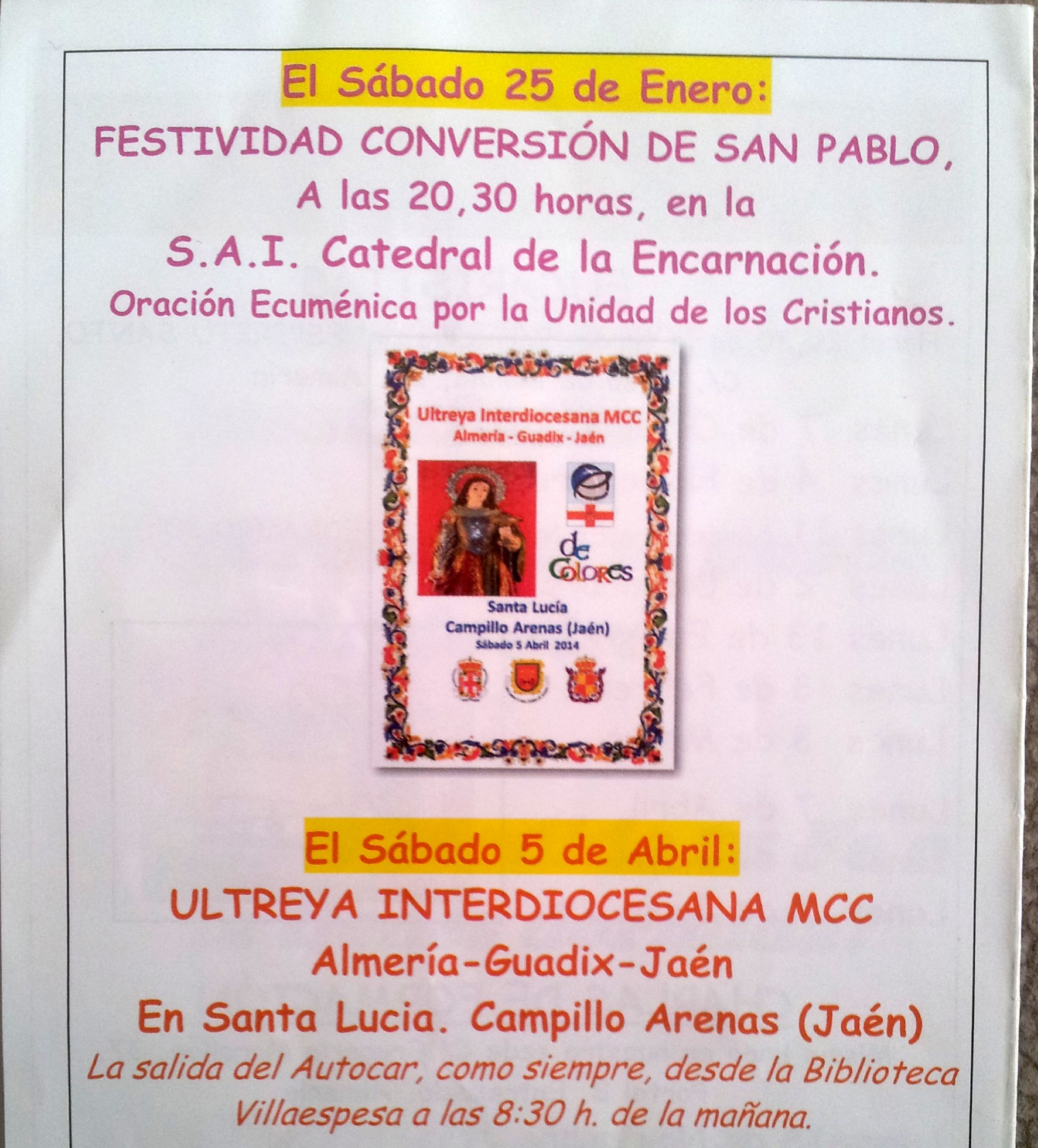 El Movimiento Cursillos de Cristiandad de Almería, ha programado la Ultreya Interdiocesana (Almería-Guadix-Jaén) para el sábado 5 de Abril de 2014, a celebrar en la Ermita de Santa Lucía de Puerta de Arenas.